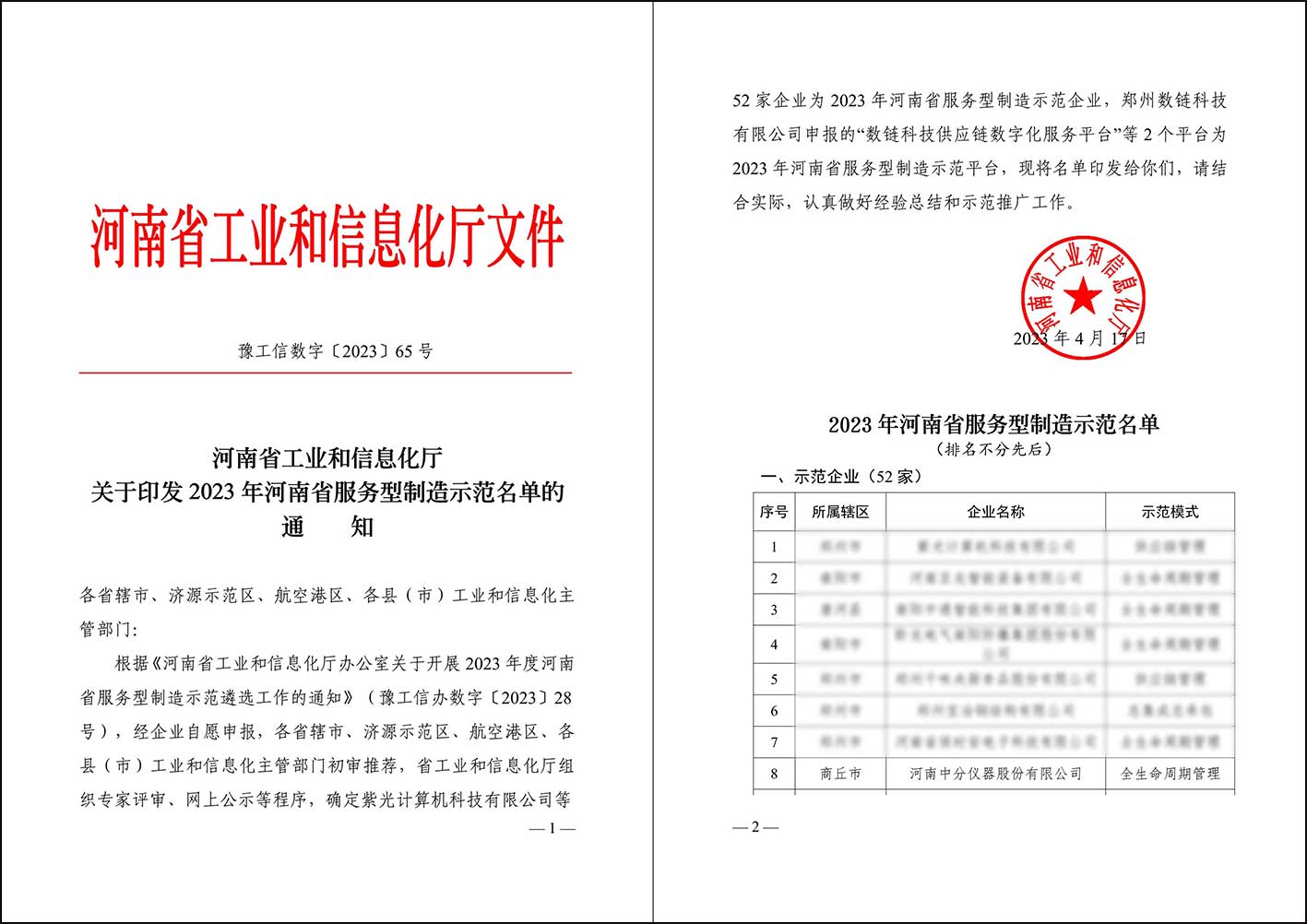 近日,河南省工業與信息化廳公布了《河南省工業與信息化廳關于印發2023年河南省服務型制造示范名單的通知》,我公司被評為河南省服務型制造示范企業,這是對我公司服務理念和綜合實力的認可。